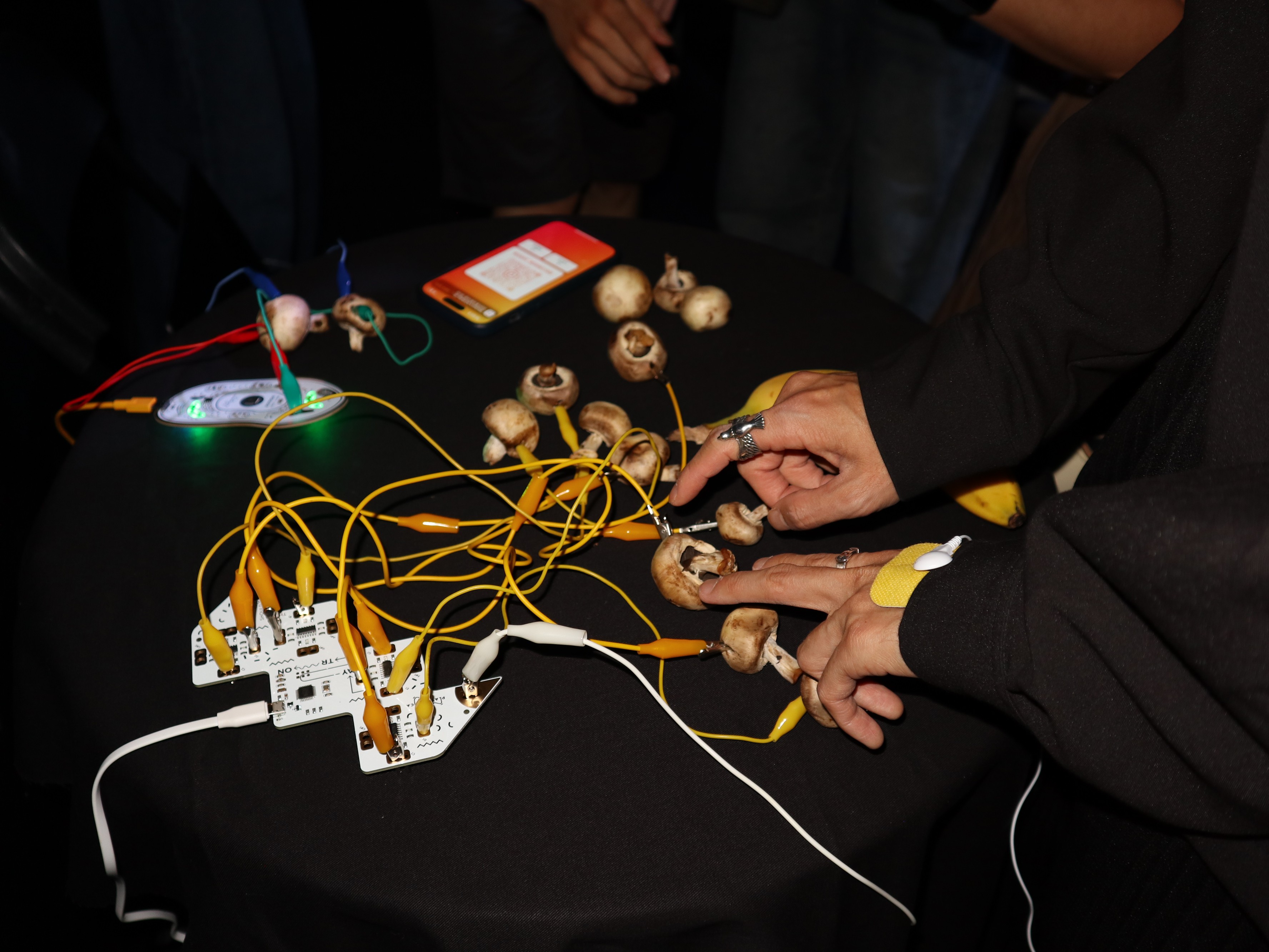 “Rhizome” Music Mushrooms is an electrical network of mushrooms that produces sound. As the mushrooms respond to human touch, they reveal a hidden underground world where fungal communication becomes song.